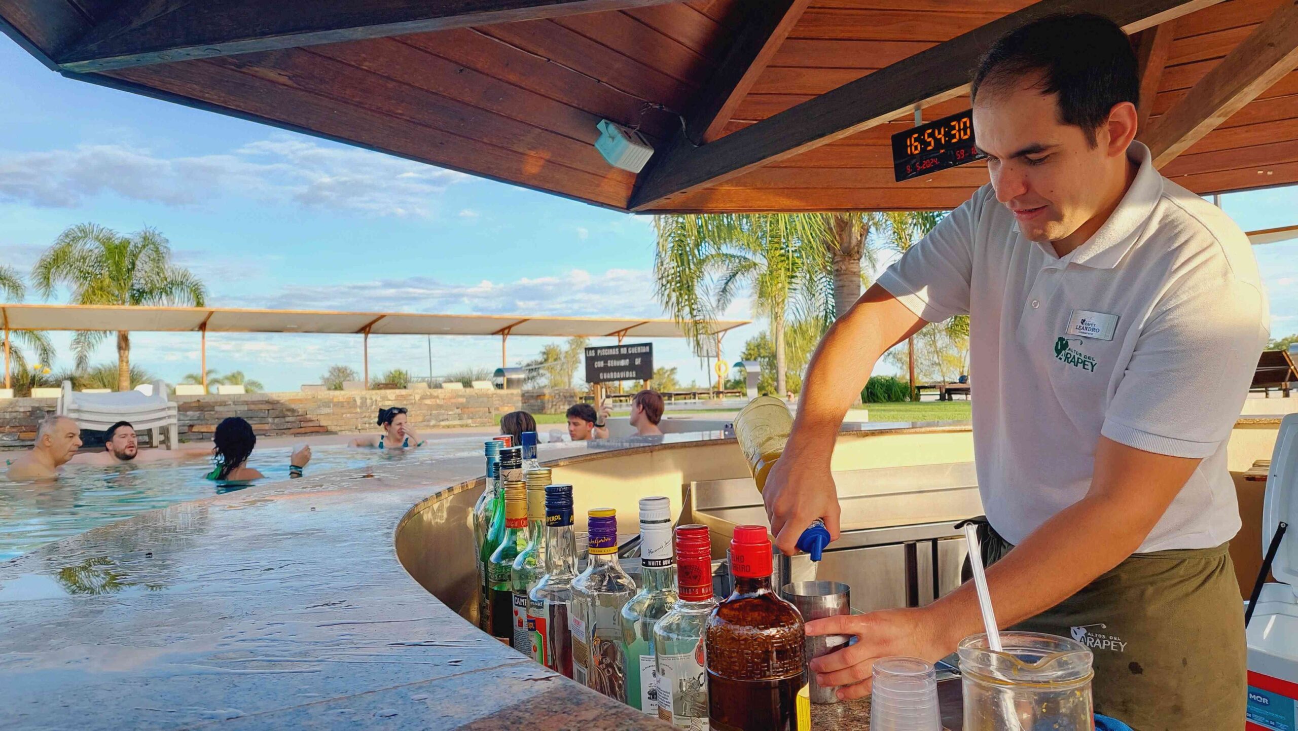 También hay un gran jacuzzi a cielo abierto para adultos (con una temperatura de 39 º C) y un «wet bar» para tomar lo que quieras sin salir del agua , hasta que el ocaso inunde el cielo y se funda con el río Arapey.