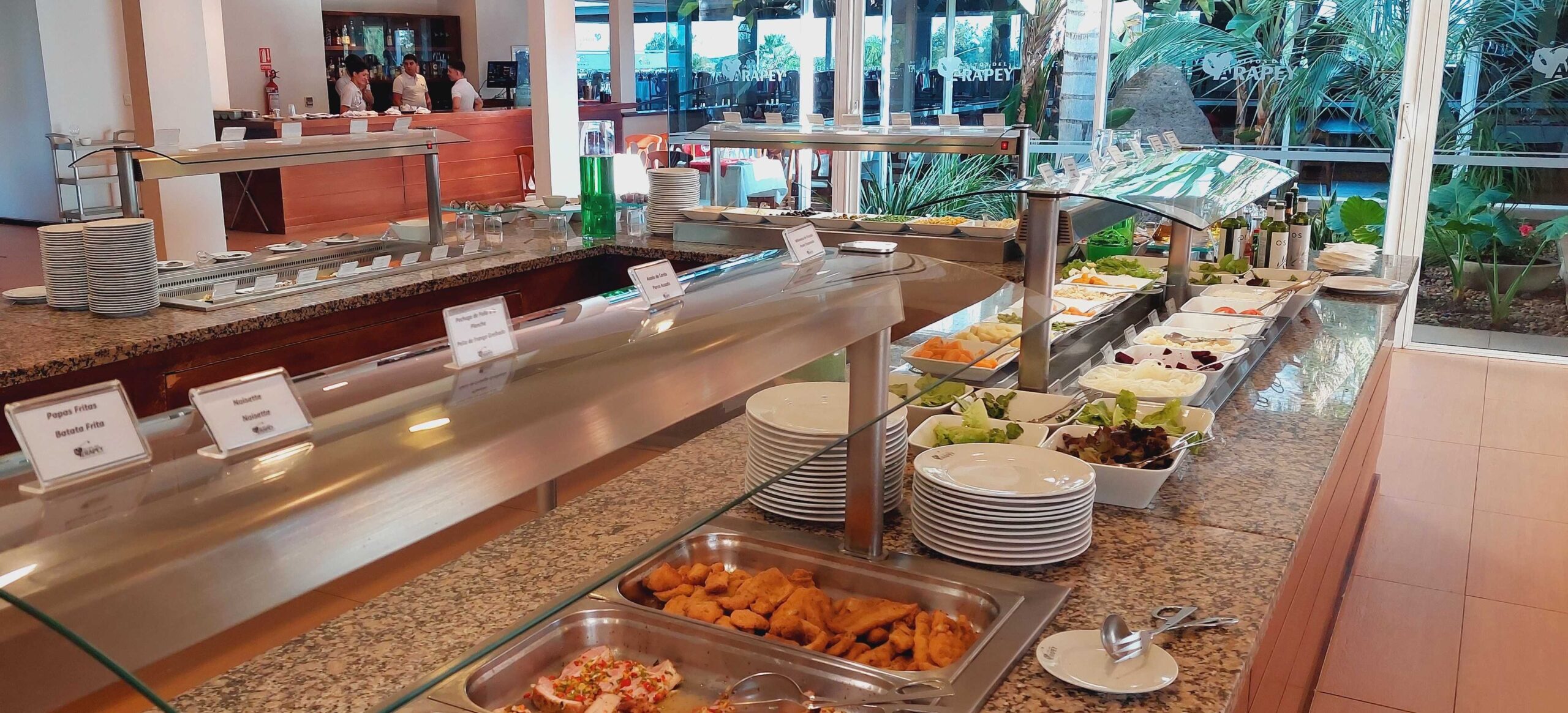 Literalmente si uno quisiera, podría estar comiendo y tomando a toda hora. Por empezar, el restaurante tiene un salón comedor y un sector donde se instala el buffet, que uno visita tanto para el desayuno, el almuerzo o la cena.