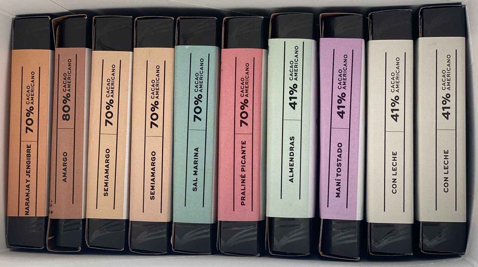 Tabletas de 100 gramos elaborados con cacaos de origen americano, realizadas de manera 100% artesanal por Rodrigo Bauni y su equipo de Chocolatiers