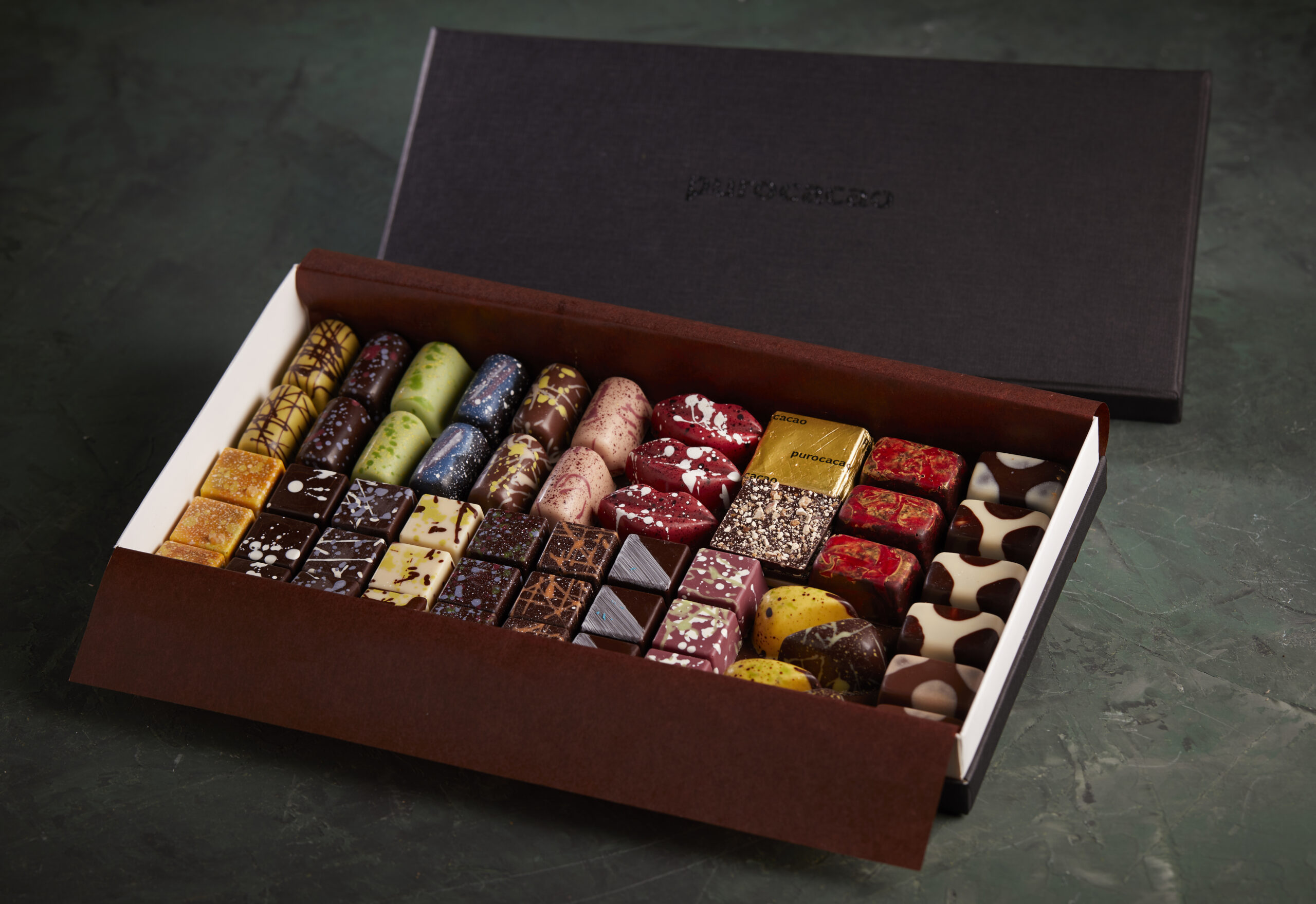 Una selección de bombones de sabores clásicos, elegida por los amigos sommeliers, chefs y otros epicúreos de PUROCACAO en un delicado estuche