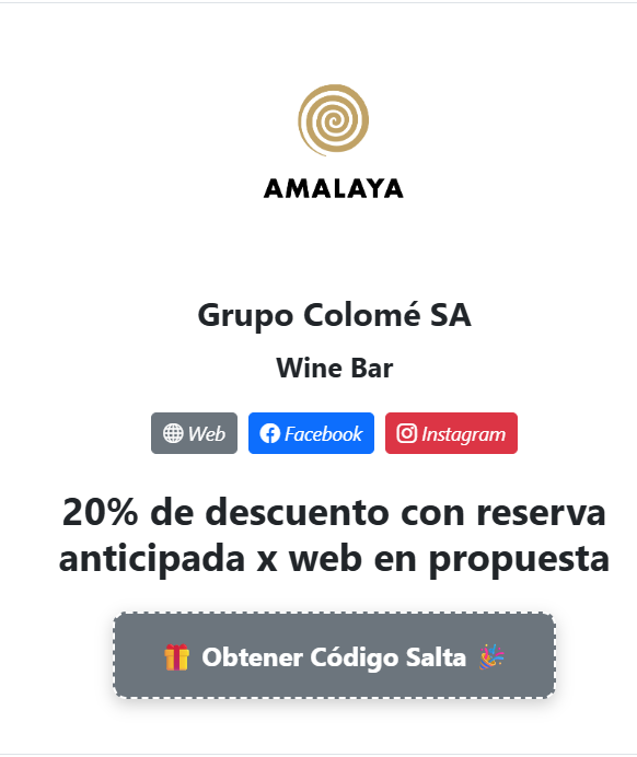 Hasta el 28 de febrero de 2026, quienes reserven con anticipación a través de la web www.amalaya.com.ar podrán acceder a un 20% de descuento en el Wine Bar.