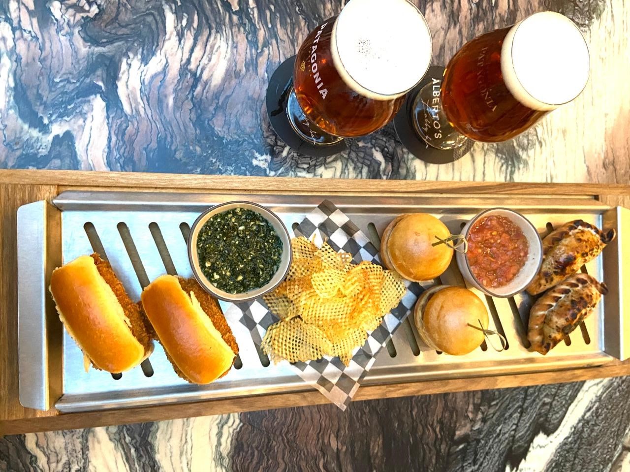 El disfrute continua en Alberto´s Lobby Bar con un sabroso tapeo de cancha que incluye mini sandwich de milanesa con papas, choripán, empanadas, y hasta una pinta de cerveza Patagonia.
