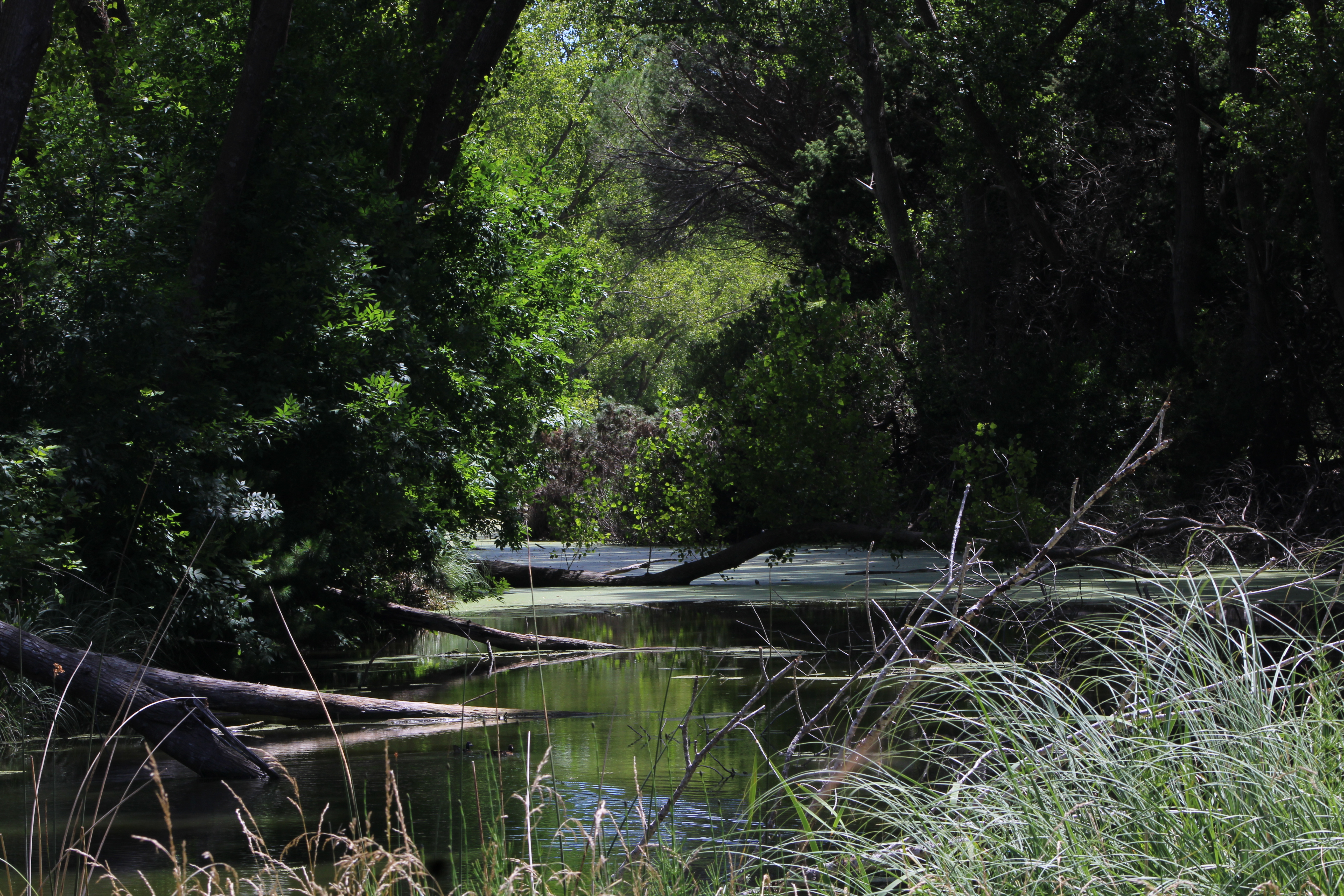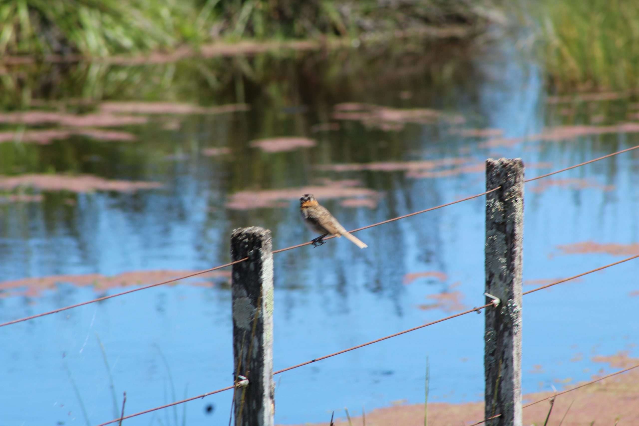 Pasamos por un par de guardaganados y tranqueras y nos detenemos al costado del camino. Un pequeño riacho que desemboca en la laguna se bifurca para rodear «la isla de los chanchos». Lugar de preferencia de los cimarrones para reproducirse.