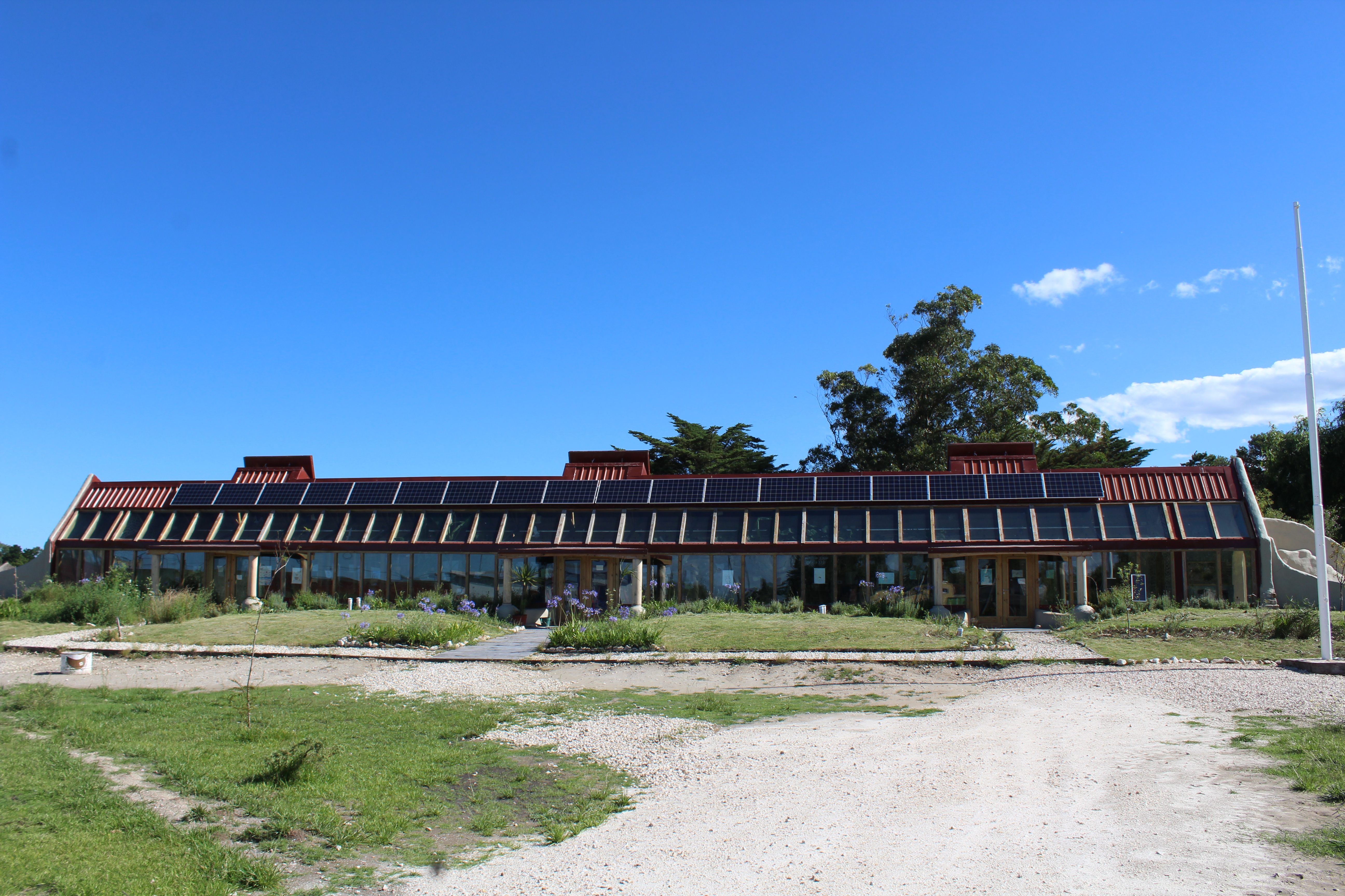 Paso por la puerta de la primera escuela sustentable del país. Utiliza paneles solares, tiene huerta, lleva adelante programas de reciclaje y reutilización del agua. Sus paredes fueron hechas con neumáticos, cartón y botellas, tanto de vidrio como de plástico. Su construcción surgió ante la la necesidad de trasladar al pueblo, la escuela primaria número 12 ubicada sobre la ruta.