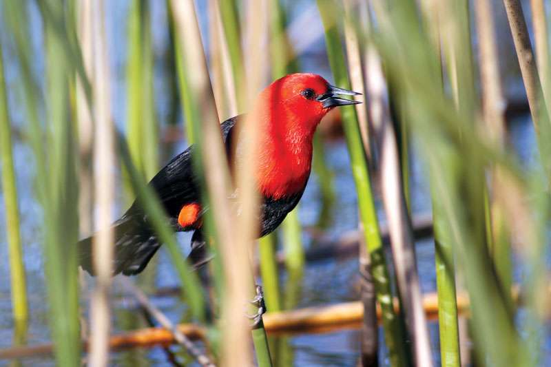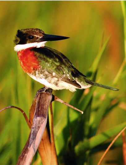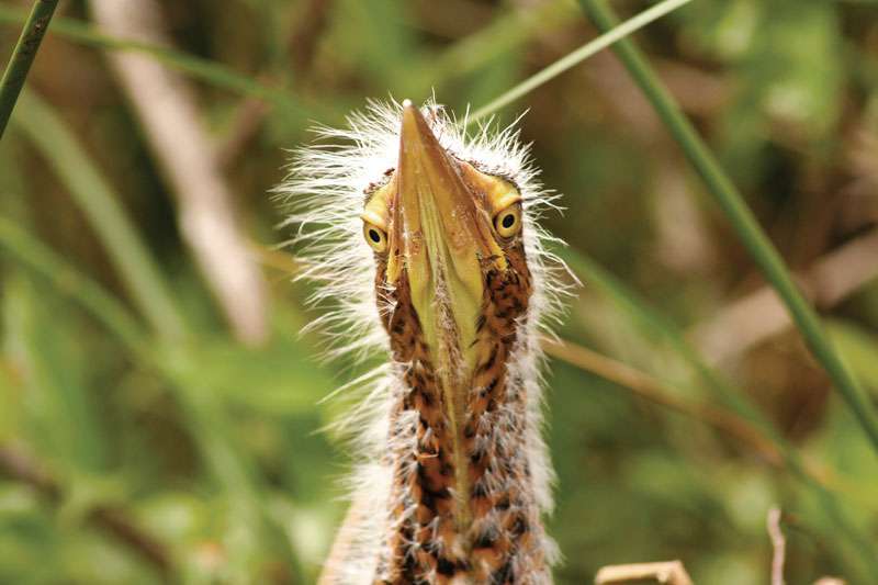 Entre los primeros juncos, apareció nuestro primer anfitrión. Un federal con su característico canto melancólico, ostentaba su extenso capuchón anaranjado rojizo que le cubre hasta el pecho y que lo hacía destacar del verde amarillento de los juncos mientras saltaba de una varilla a otra. Más adelante, oculto entre la vegetación y completamente inmóvil, confiando en la efectividad de su camuflaje, un pichón de Ocó colorado me sorprendió con su extraña apariencia que le daban sus plumas encrespadas y sus saltones ojos anaranjados. No había avanzado mucho cuando avisté sobre una delgada capa de hojas que flotaban sobre la superficie, una jacana que cuidaba su nido desplegando sus alas.