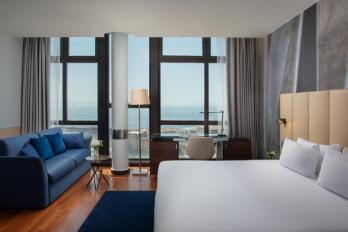El NH Napoli Panorama ofrece habitaciones inundadas de luz que se filtra entre ventanales amplios, con vistas que abarcan la ciudad y el mar.