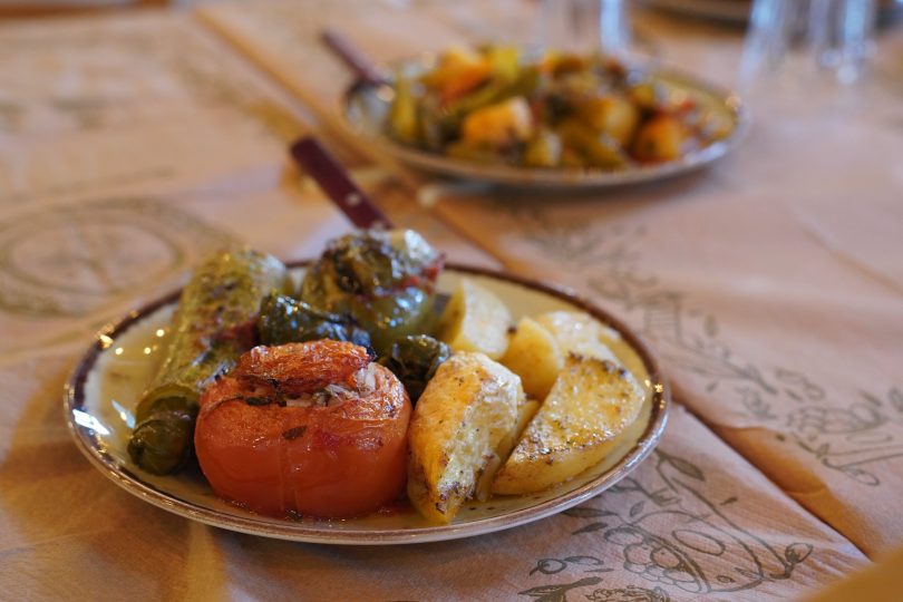 El centro emocional de la experiencia se encuentra frente a las brasas. El antikristo se prepara con una devoción que trasciende la técnica. Grandes piezas de cordero se disponen alrededor del fuego, enfrentadas al calor con respeto, girando lentamente hasta alcanzar una cocción que combina jugosidad interior y carácter ahumado. El proceso exige espera, conversación, un vaso de raki que circula entre las manos. Comer antikristo en Xylouris equivale a participar de un ritual colectivo, una ceremonia donde el tiempo se dilata y el sabor se vuelve narrativo.